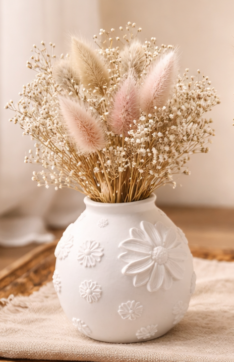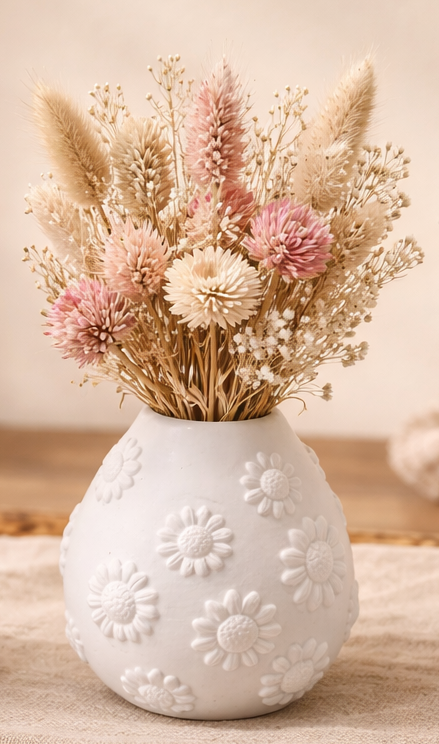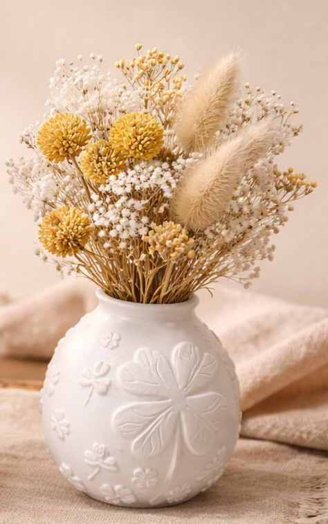 Entdecke unsere elegante Vase mit liebevoll arrangierten Trockenblumen – ein dekoratives Highlight für dein Zuhause. Diese Vase vereint zeitlose Ästhetik mit natürlicher Schönheit und setzt überall eindrucksvolle Akzente. Ganz gleich, ob im Wohnzimmer, auf dem Esstisch oder im Eingangsbereich, sie sorgt für ein harmonisches Wohnambiente.